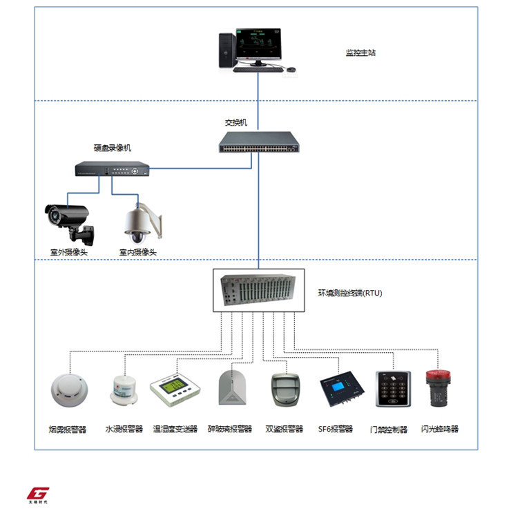 供电境遇安乐监控体系的构成包罗:监控主站、视频开发、境遇测控终端RTU、境遇传感器(温/湿度、烟雾、水浸、玻璃、门禁、SF6气体等)。此中境遇测控终端RTU、境遇传感器等成立正在箱变、变电所内。